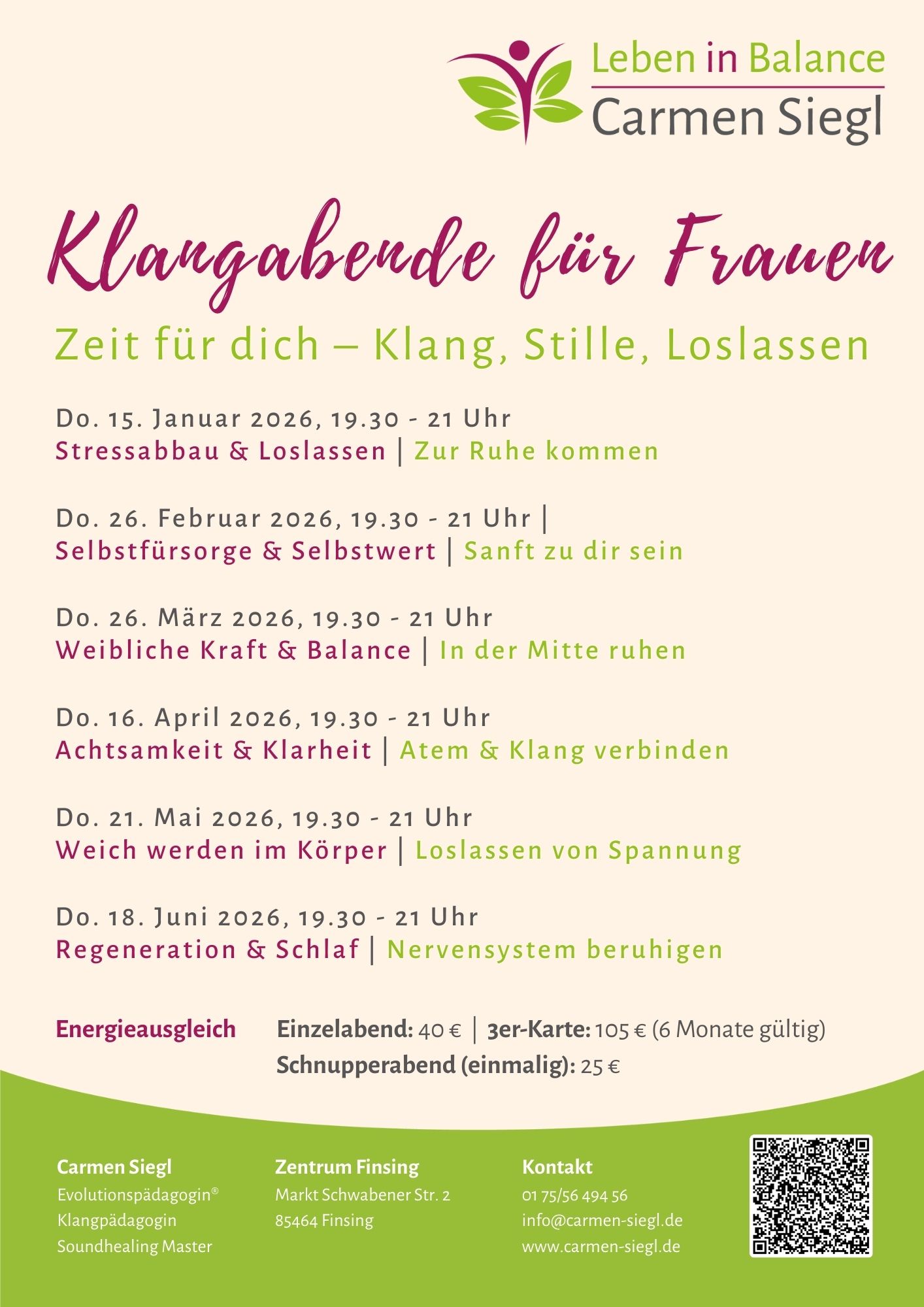 In einer kleinen Frauengruppe tauchst du ein in eine sanfte Klangentspannung mit Klangschalen, Koshi-Klangspiel, Sansula, Monochord und weiteren Klanginstrumenten. Die harmonischen Schwingungen tragen dich in die Ruhe, unterstützen Loslassen und fördern dein inneres Gleichgewicht.